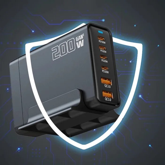 A 200W GaN charging station is a high-power desktop charger that uses Gallium Nitride (GaN) technology to deliver fast, efficient, and safe charging for multiple devices at the same time.